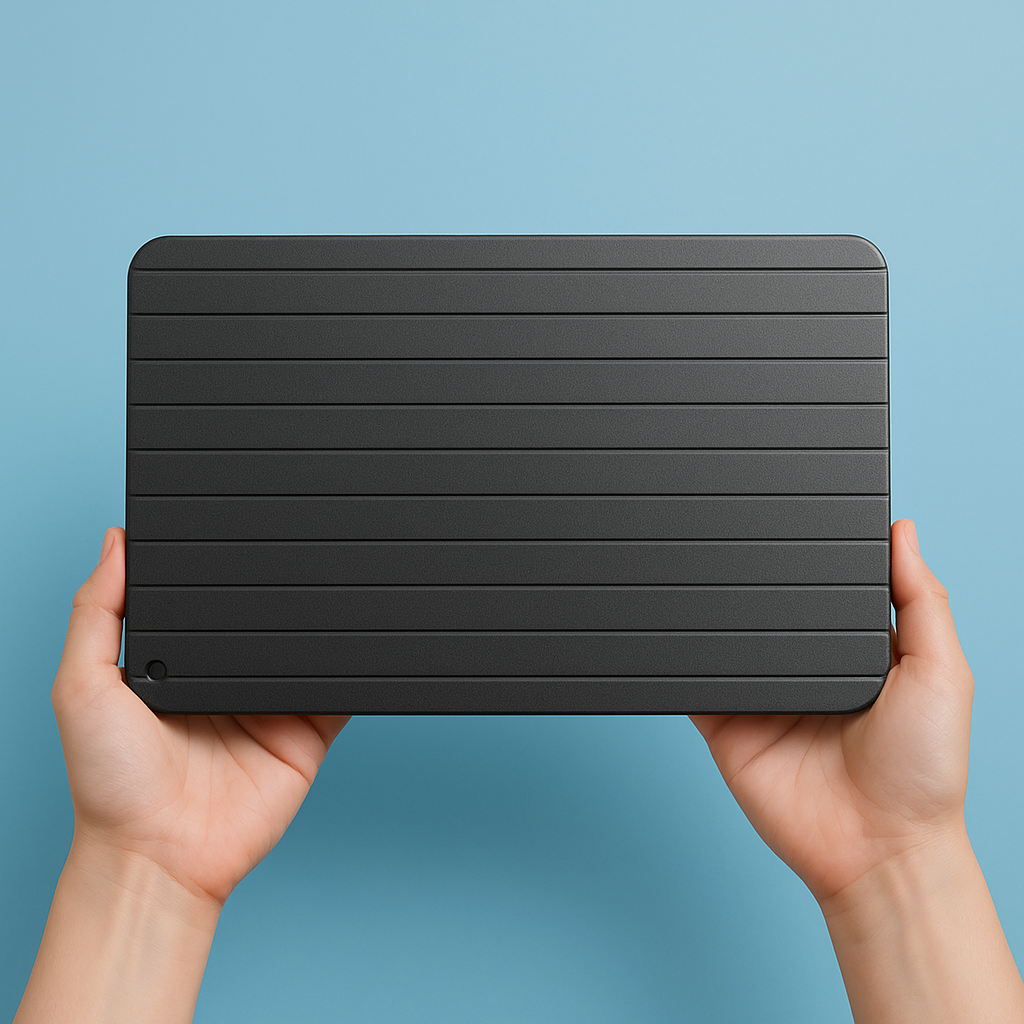 Utiliser MyPlaky est très simple : posez directement vos aliments congelés (viande, poisson, légumes, etc.) sur la plaque — sans eau ni électricité. L’alliage conducteur accélère naturellement la décongélation.