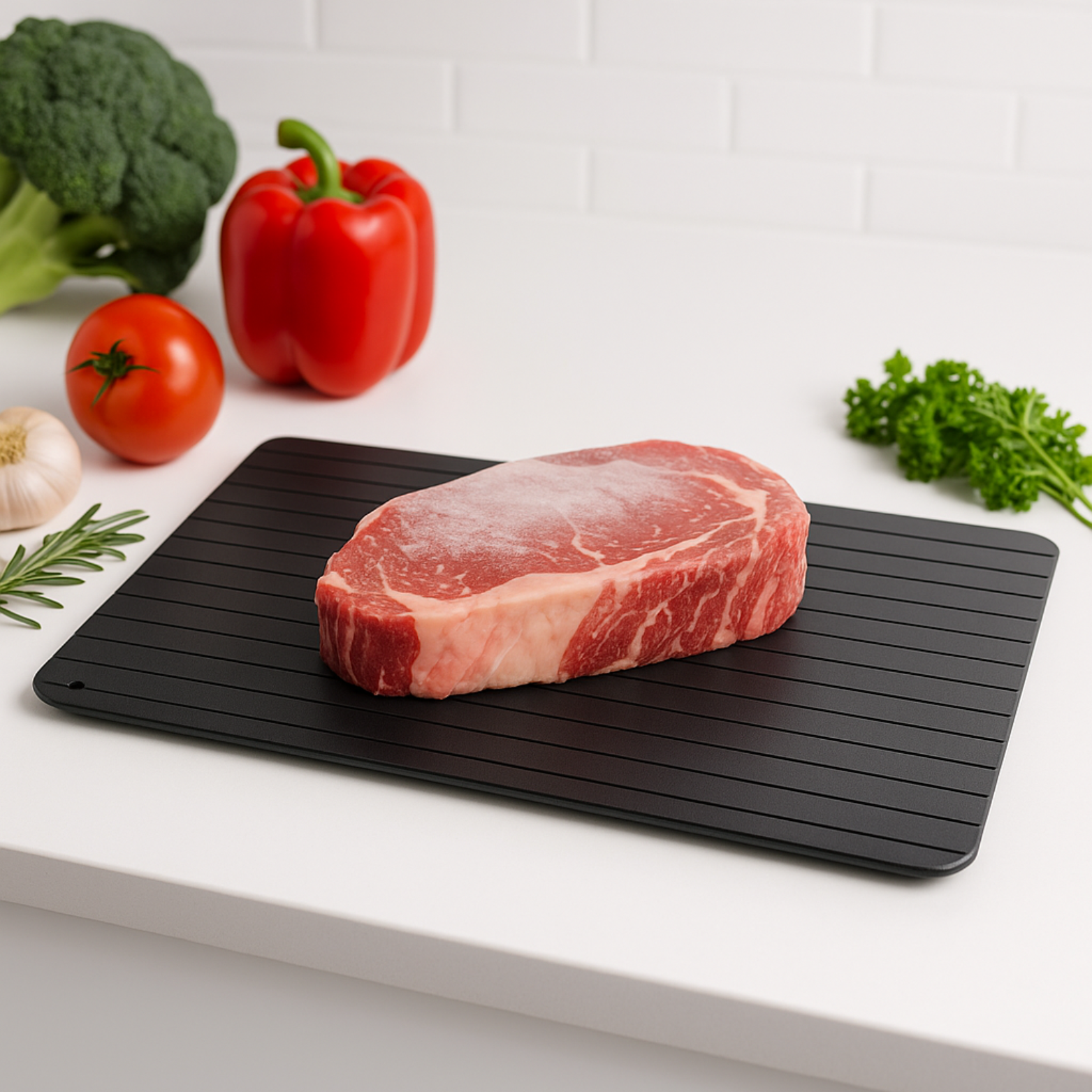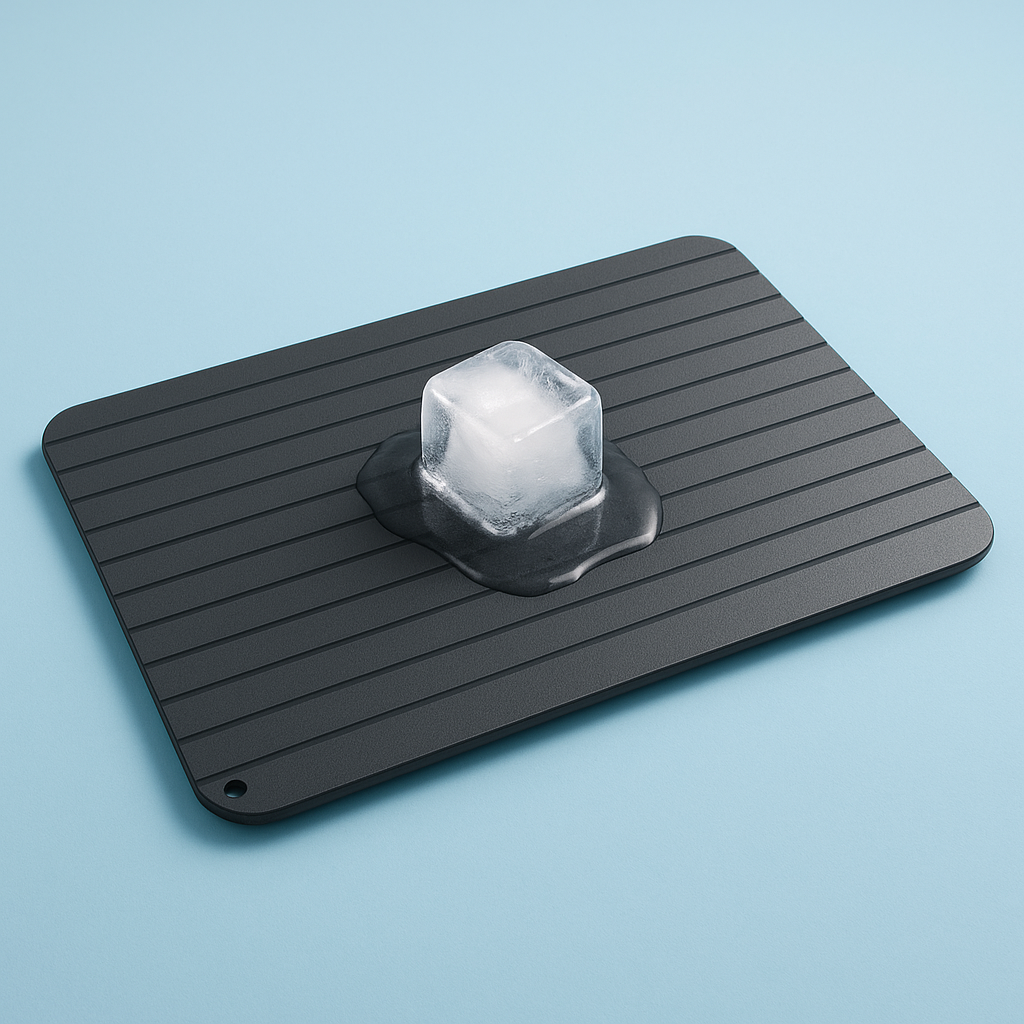 Utiliser MyPlaky est très simple : posez directement vos aliments congelés (viande, poisson, légumes, etc.) sur la plaque — sans eau ni électricité. L’alliage conducteur accélère naturellement la décongélation.